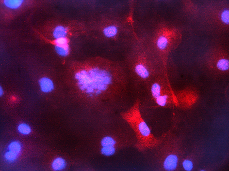 Staining of VWF/Factor VIII (dilution 1:100). Secondary antibody conjugated to Alexa 594 (red) and counterstained with DAPI (blue). Cell were mounted using iBrite mounting media.