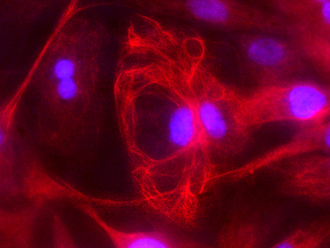 Staining of Desmin (dilution 1:100). Secondary antibody conjugated to Alexa 594 (red) and counterstained with DAPI (blue). Cell were mounted using iBrite mounting media.