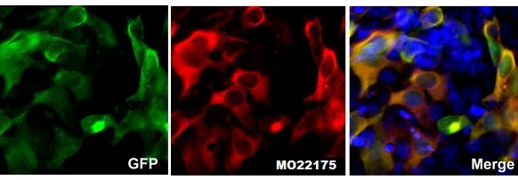 Transfected HEK293 cells with GFP-Cas9-SA fusion protein were stained with MO22175 antibody. GFP is expressed in the transfected cells (green). GFP-Cas9 fusion protein is stained with MO22157 antibody at 1:1,000 dilution (red). Only transfected cells are reactive with MO22157 antibody, which appear in a yellow-orange color (merge). Nuclei are visualized in blue with Hoechst staining.