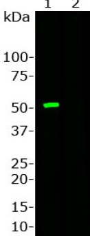 Image: Western blot analysis of MO22175 1: HEK293 cells which overexpressed fusion protein containing GFP and c-terminus of Cas9 from S. aureus. 2: Non-transfected HEK293 cells. There is a strong clean band at about 53 kDa corresponding to GFP-Cas9 fusion protein, which is absent in non-transfected cells. MCA-6F7 antibody is diluted at 1: 1,000 dilution