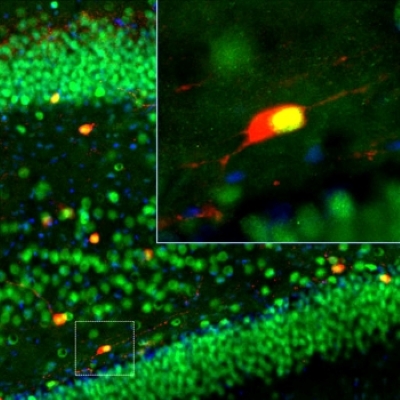 Image: Adult rat brain cortex sections were stained with our polyclonal chicken Calbindin antibody (CH22118) and monoclonal mouse Fox3/NeuN antibody (MO22112).