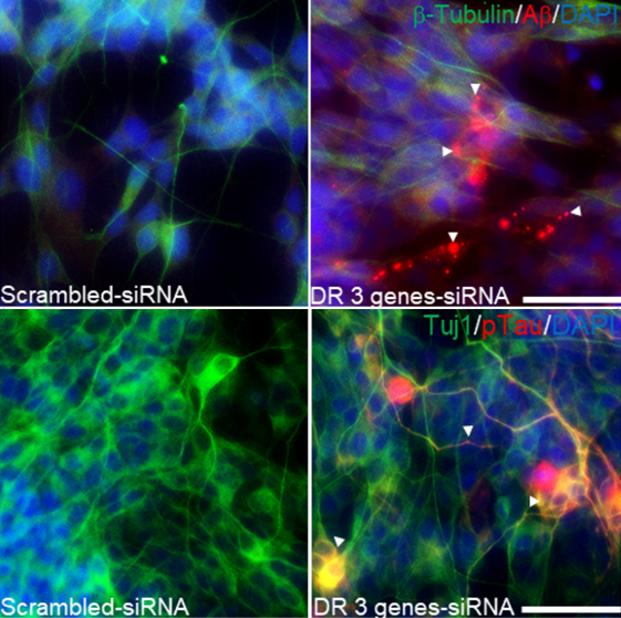 Image: "Analysis of the effect of siRNA mediated individual or combined knockdown of the top 3 downregulated genes, GJA8, CryAA2 and PSG6, on the AD infectious etiology gene signature in primary human neurons. Cellular A aggregation (top row) and cellular p-Tau deposition (bottom row). AB Aggregate and p-Tau accumulation in the cytoplasm or neuronal axon are indicated by white arrowheads. Scale bar, 50 µm."