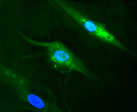 Human Schwann Cells (cat no. HMP303) stained with P0 (CH23009, green fluorescence) + DAPI (blue) counterstain.