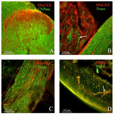 Micrographs depicting SSeCKS colocalization with myelination markers (CNPase and Pzero). rmen et al. Journal of Brachial Plexus and Peripheral Nerve Injury 2008 3:8 doi:10.1186/1749-7221-3-8.
