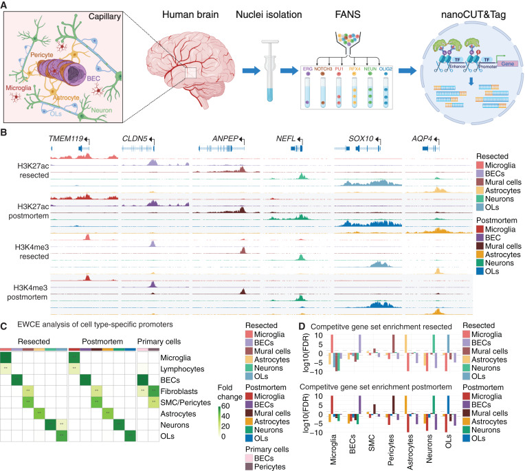 Image: (A) Schematic of nuclei isolation and epigenomic profiling of brain cell types from resected and post-mortem cortical samples. (B) UCSC genome browser visualization of H3K27ac and H3K4me3 CUT&Tag at cell-type-specific marker gene loci.(C) EWCE analysis of cell-type-specific promoters for resected and post-mortem brain cell types and for primary pericytes and BECs in brain single-cell gene expression.5∗Benjamini-Hochberg-corrected q < 0.05; ∗∗Benjamini-Hochberg-corrected q = 0. (D) CAMERA analysis of cell-type annotations from brain single-cell gene expression5 using differential promoters from resected and post-mortem brain cell types.
