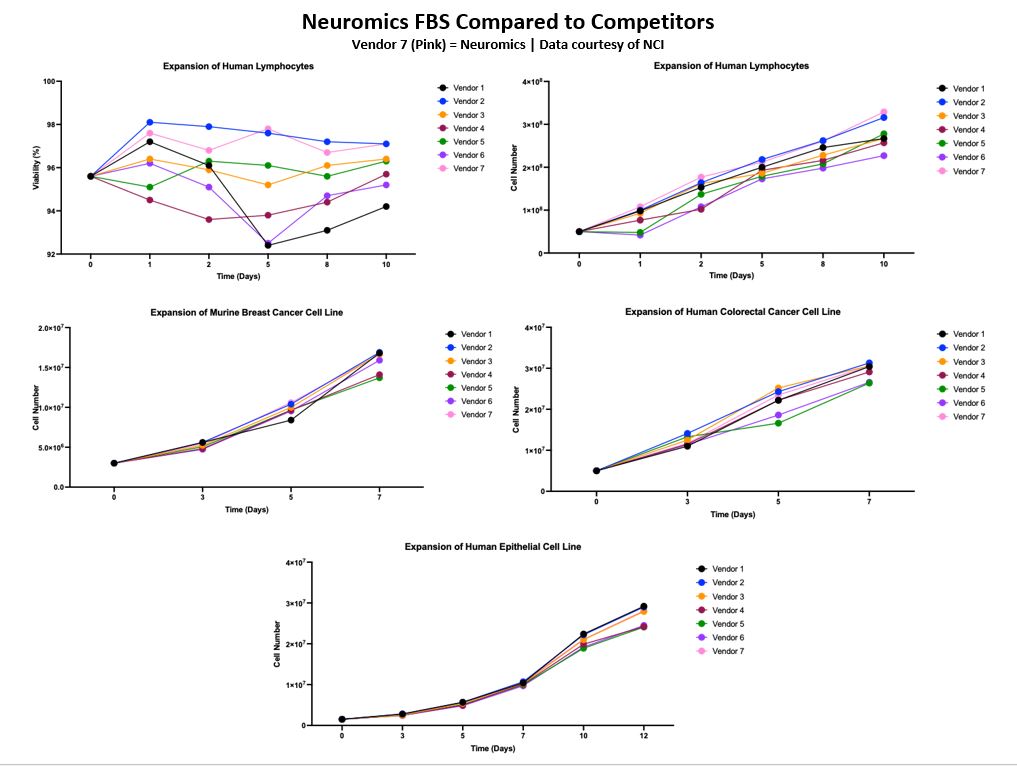 At Neuromics, we strive to deliver Fetal Bovine Serum (FBS) to researchers that is of the highest quality while being the lowest priced. New data provided to us by researchers at the National Cancer Institute demonstrates that we are winning!