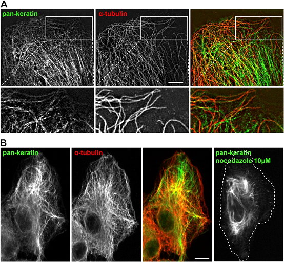 Images: Keratin filaments are associated with microtubules. A) 3D-SIM imaging of keratin and tubulin immunostaining of RPE cells. The enlargements show the alignment of keratin filaments with microtubules. Scale bar, 5 mm. B) Confocal imaging of keratin and tubulin immunostaining. In control cells, keratin filaments extend to the cell periphery, and the filaments retract into the perinuclear region after 3-h treatment with 10 mM nocodazole to depolymerize microtubules. Scale bar, 10 mm.